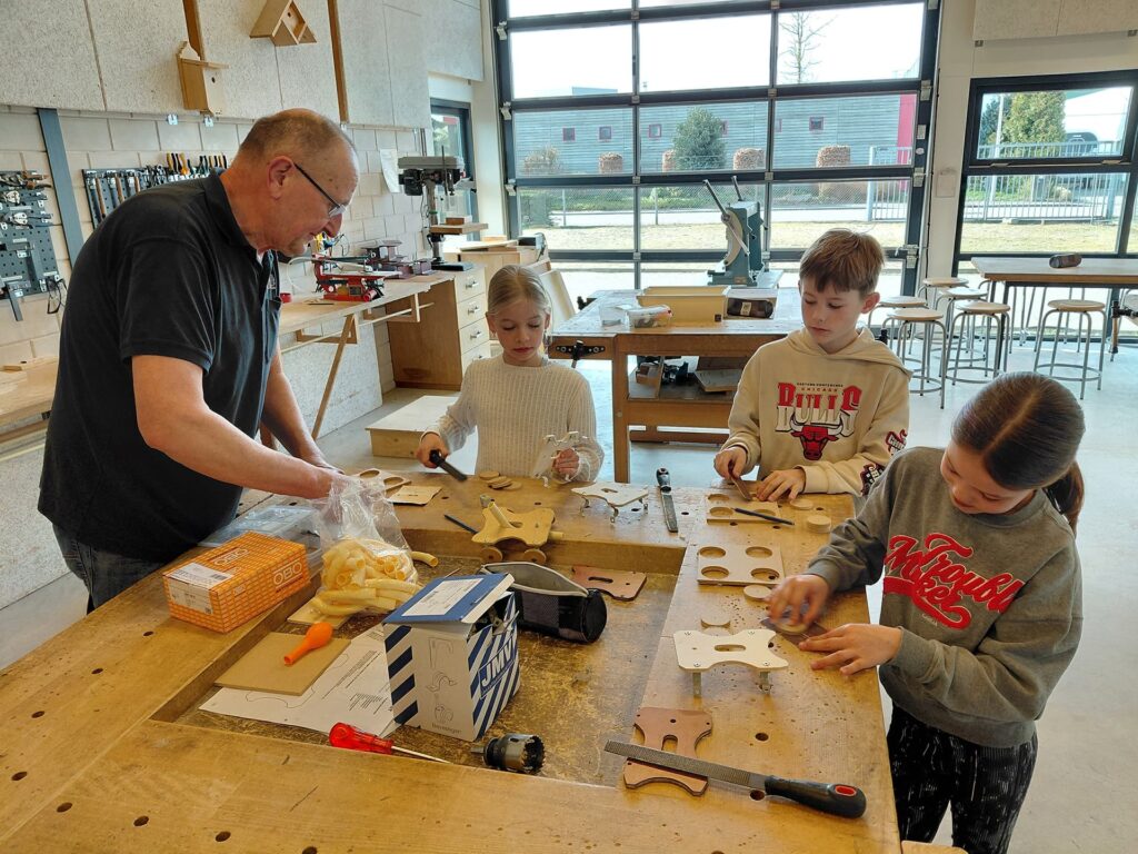 Iedere vrijdagochtend is Aart daarom te vinden in het Technieklokaal Berkelstreek. Stipt om 9 uur op deze vrijdagochtend wandelen 19 basisschoolleerlingen en hun leerkracht het Technieklokaal binnen. Na wat uitleg, begeleiden 5 vrijwilligers de kinderen met verschillende opdrachten aan de werkbanken. Aart begeleidt deze ochtend een groepje van 4 leerlingen bij het maken van een ballonracer. Er wordt druk met potlood afgetekend, gezaagd – met de hand en de elektrische figuurzaag , getimmerd, gemeten, geboord en gehamerd onder ontspannen en toeziend oog van Aart: “Denk je er nog even aan om de veiligheidsbril op te zetten?”.